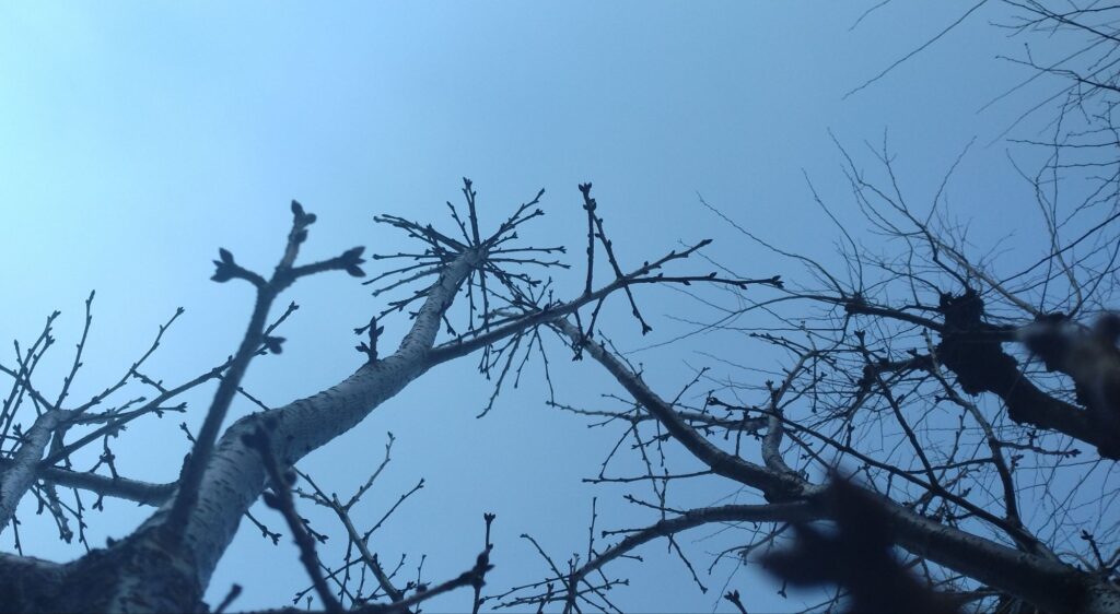 道端の桜の木を見たら、つぼみの形がはっきりと見えた。あと、ひと月もしたら、このつぼみが膨らんでくるのだろう、とのぞき込むと、枝先がきれいな放射に広がっている。